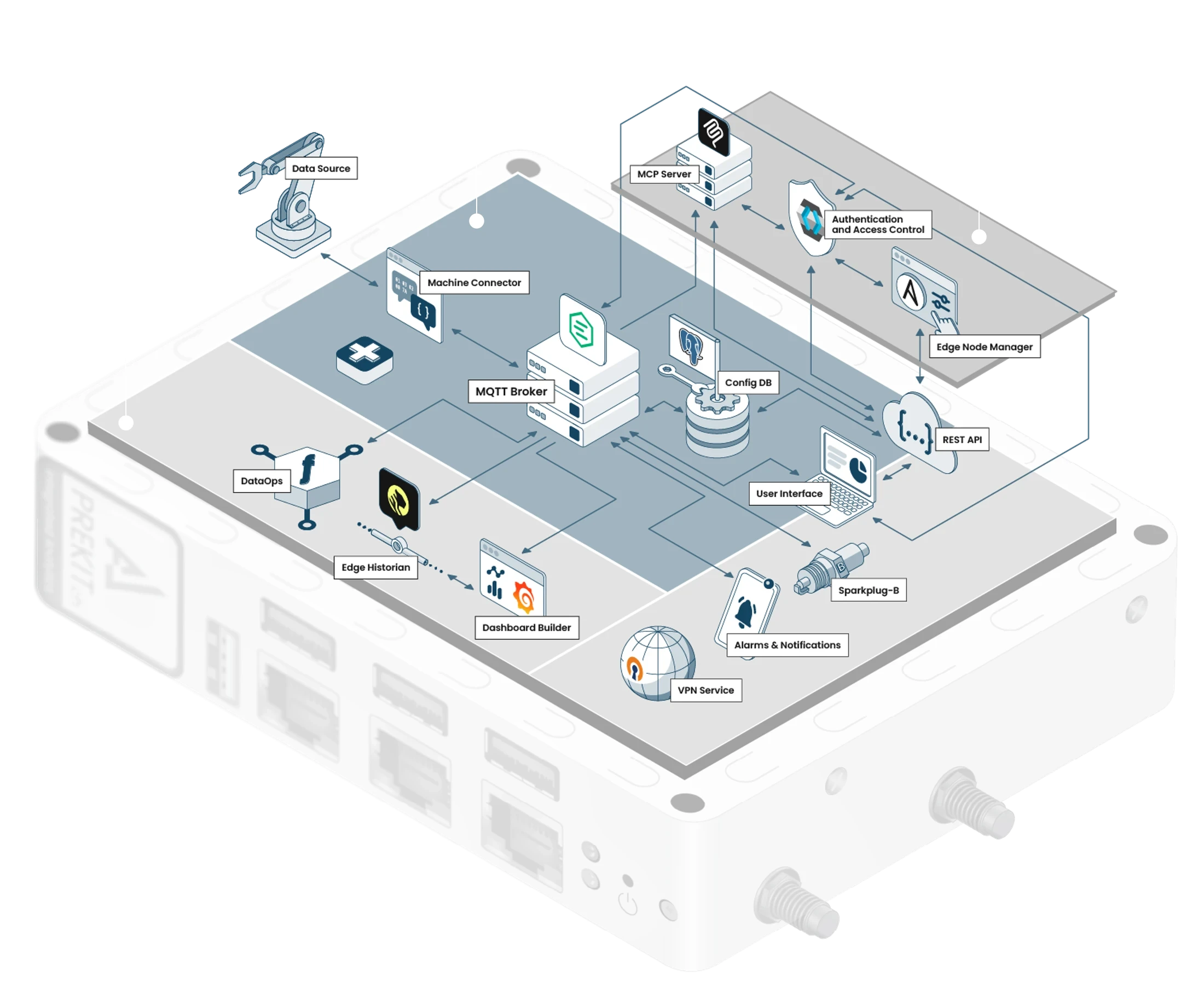 PREKIT bietet eine sichere, Edge‑getriebene und herstellerneutrale Möglichkeit, einen Unified Namespace über Nodes aufzubauen, die mit den SPS Ihrer Anlagen und weiteren Datenquellen verbunden sind.